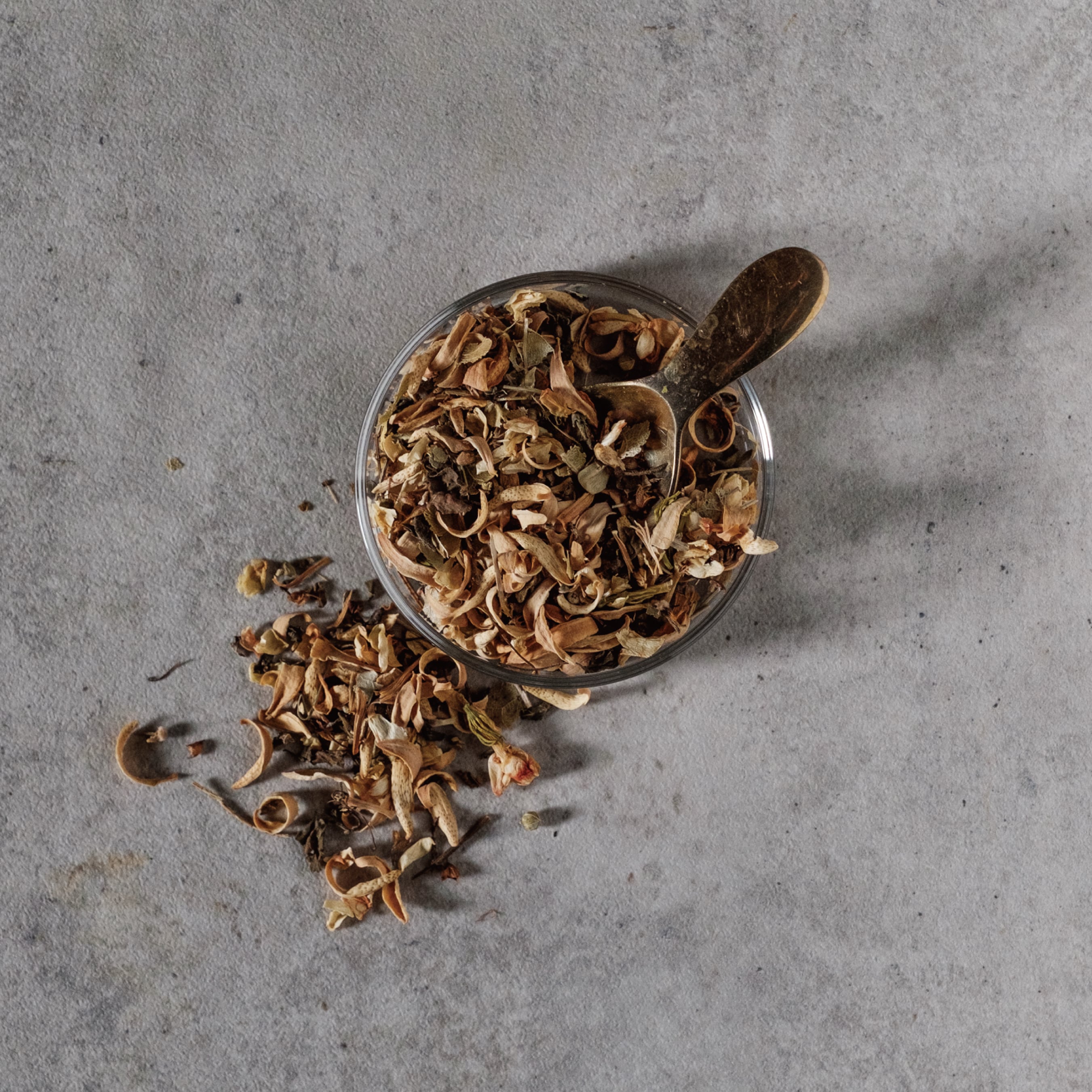 有機リンデンフラワー(ポーランド産)、オレンジフラワー(イラン産)、トゥルシー(有機原料使用:インド産)、ジャスミン(中国産)